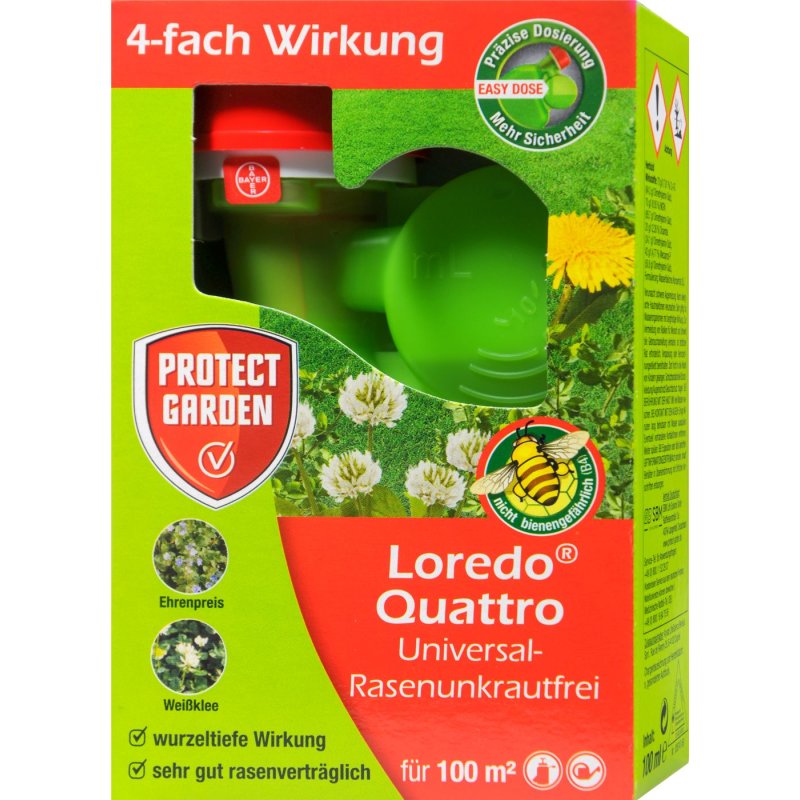 Loredo quattro gefährlich . Das loredo quattro sollte nicht bei temperaturen über 25 °c ausgebracht werden. Mindestens 6 stunden nach der ausbringung sollte es nicht regnen. Das präparat kann auch auf blühende rasenunkräuter gesprüht werden, da es nicht bienen gefährlich ist. Der behandelte rasen muss trocken sein. Eine stärkere behandlung von unkrautnestern.